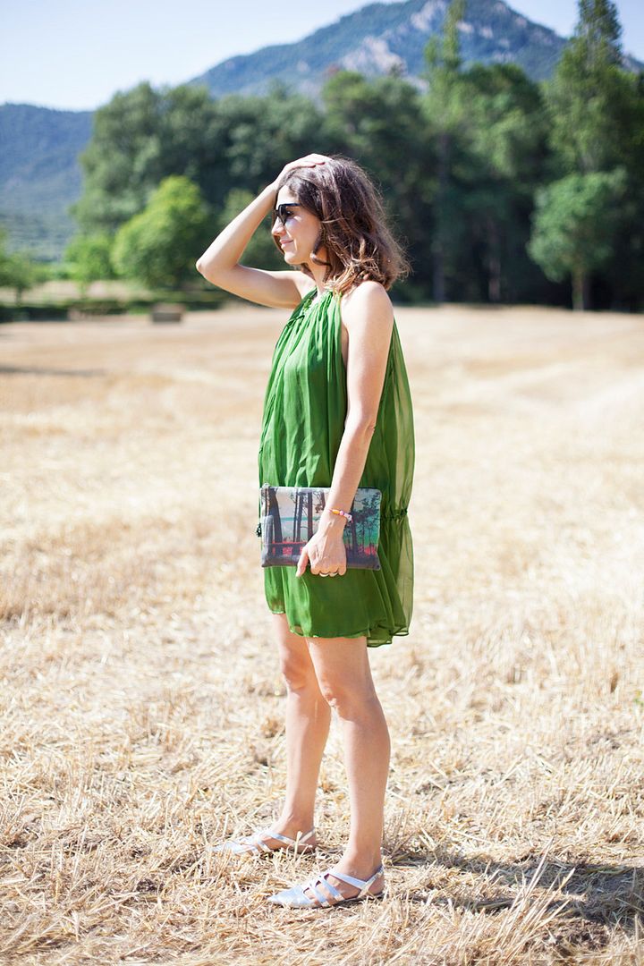 ¡Hola! Hoy sí, ¡viva San Fermín! Espero que quienes estéis en Pamplona, lo estéis disfrutando mucho. Yo sigo en medio de la naturaleza y hoy para ir a tono con mi entorno he elegido un vestido verde intenso de Zara. El color es muy favorecedor; el vestido es fresquito y con un punto original, digamos.