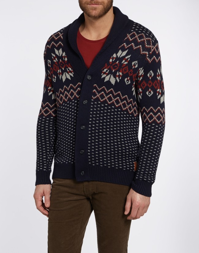 Es el caso de la chaqueta de la imagen. Cárdigan de punto grueso y cuello chal. Se inspira en el diseño típico de la isla de Fair, en Escocia. Un clásico renovado que podrás llevar sobre camisas y camisetas este invierno. Se trata de un modelo de manga larga abotonado.