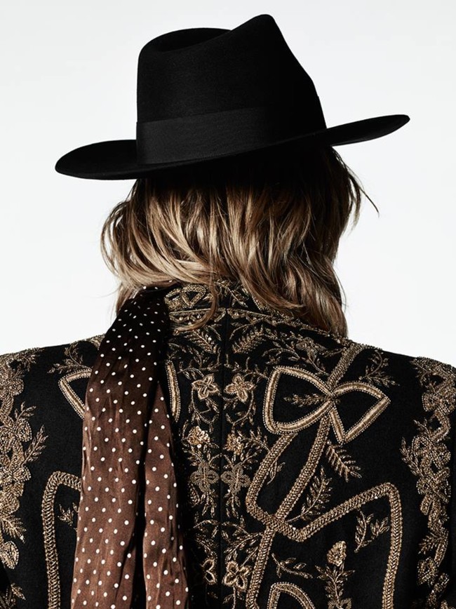 Una colección presidida por una silueta andrógina y afilada, que es una reinterpretación de la estética de Yves Saint Laurent de los años 90 donde no faltan los sombreros de ala ancha, las chaquetas con tela de tapiciería y las botas con acabados dorados o metalizados.